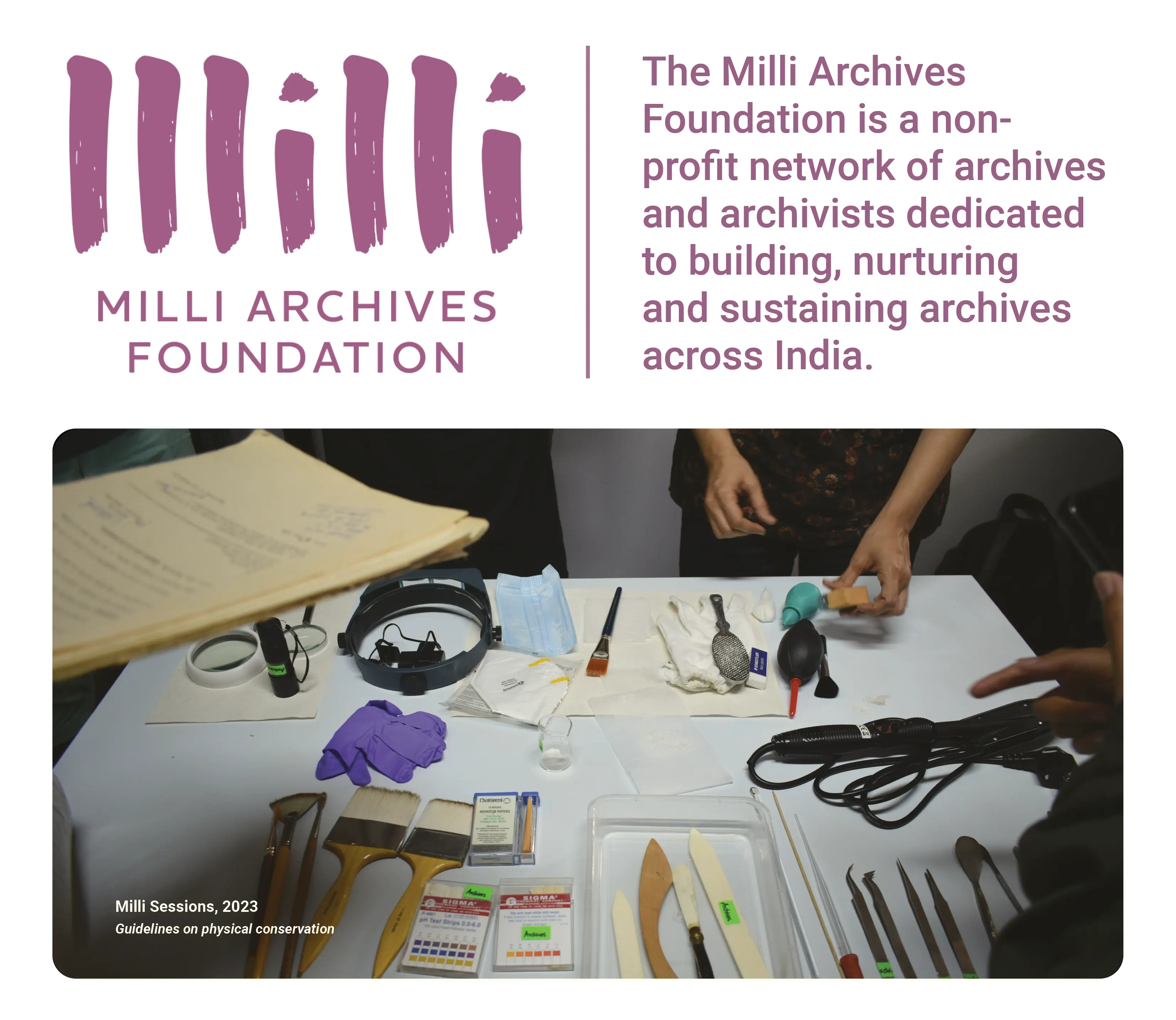 The founding of the Milli Archives Foundation was the result of deliberations within ‘Milli’, a collective of individuals and communities who are passionate about archives. Over the years, the above mentioned ideas have gathered steam through collaborations and the free-to-public Milli Sessions, with over 1500 registrants, over 400 active participants from across India and other countries, and 40+ partnering institutions. There really has been no equivalent to this in the past, and it is a unique initiative even at a global scale. All material from the Sessions is publicly accessible: Milli Sessions.